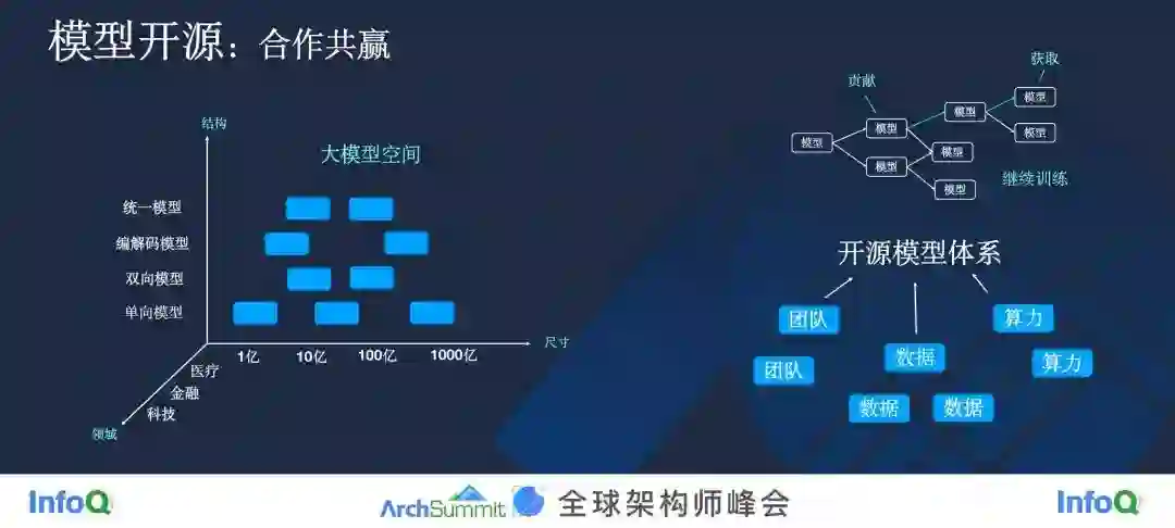 一是坚持模型开源。 大家对代码的开源很熟悉,但模型的开源完全是一个新的模式,一个新的世界。我们可以把所有大模型放在一个空间里边,它们有不同的尺寸,也有不同的模型参数,也有不同的领域。我非常倡导大家一起构建一个大模型的开源体系。在这个体系下,我们每个人都把模型开源出来,当你做一个新的模型的时候,不需要从头开始训练。