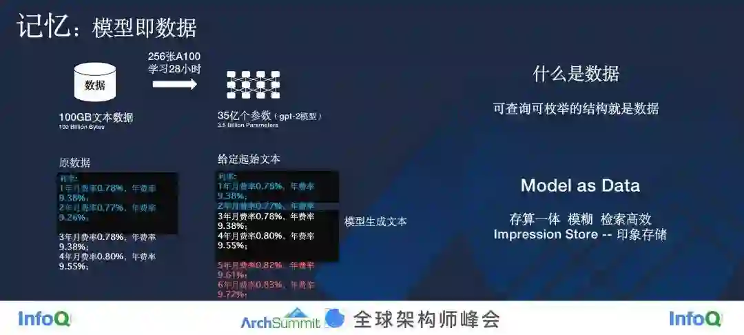 在十多年前,我做大数据框架的时候,都是存算一体,因为当时的网络带宽实在是不够,而处于云时代的今天,网络速度远高于硬盘,所以大家都搞存算分离。模型即数据(Model as Data)最典型的优点是存算一体,那么我们现在如果用大模型来做的话,它就是另外一种意义的存算一体。也就是说,在大模型里边,一切数据都是用模型参数和模型结构来表示的,它相当于是一个黑盒,你不知道这个数据到底是怎么存的,也不知道它是怎么查询出来的,我们真真正正地把查询跟计算混在了一个大模型里边。