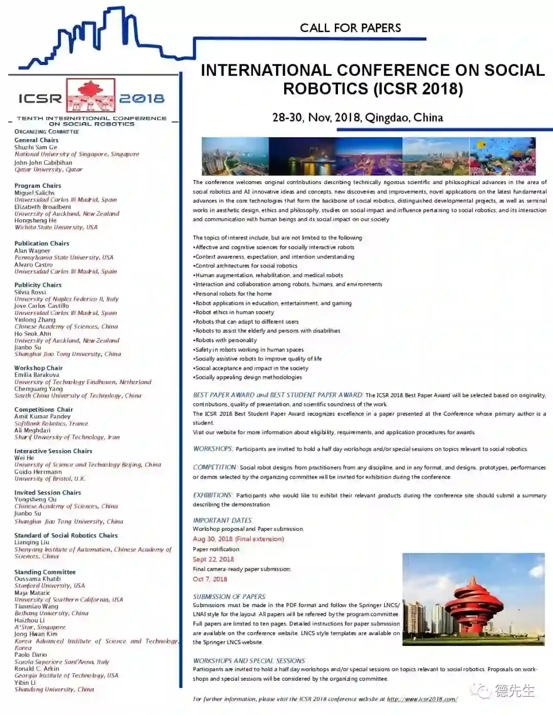 会议欢迎在社会机器人和人工智能领域的科学技术和思想理论的原创贡献,包括:创新的想法和概念,新发现和改进,对构成社会机器人支柱的核心技术的最新基本进展,杰出的发展项目,美学设计、伦理和哲学方面的开创性工作,有关社会机器人的社会影响研究,社会机器人与人类的互动交流,以及它对我们社会的影响。