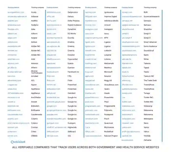 Cookiebot对爱尔兰卫生服务网站的15个页面进行了扫描,发现其中近四分之三页面都含有广告追踪工具;而就法国政府有关流产服务的一个页面而言,有21家不同的公司正在对这个页面进行监控。一个有关产假的德国网页遭到了63个追踪工具的监控,而在提供艾滋病病毒症状、精神分裂症和酒精中毒相关信息的卫生服务网页上则发现了谷歌DoubleClick追踪工具。