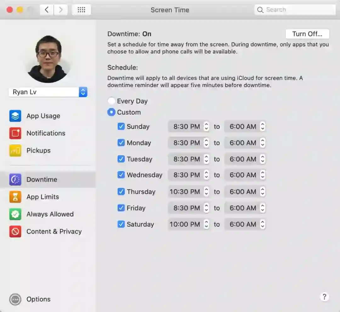2.给自己的 Macbook 开启了屏幕时间管理。非工作时间,电脑对我诱惑最大,我经常熬夜玩电脑。为了按时作息,我给自己的 Macbook 开启了屏幕时间管理。晚上 20:30 之后,自动锁定所有软件,禁止自己工作。