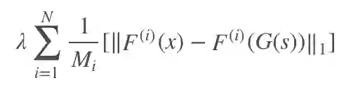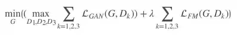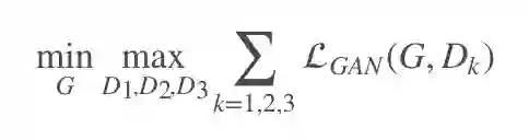 其中表示判别器 Dk 提取的第 i 层特征,T 为总的层数,Ni 为该层总元素的个数。于是,总的目标函数如下: