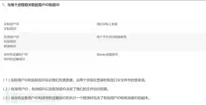 大概意思就是说,调用进程时进程会涉及到这些id,而进程是否能够对文件和目录进行操作,则是由有效用户Id、有效组Id以及附加组Id去判断的。