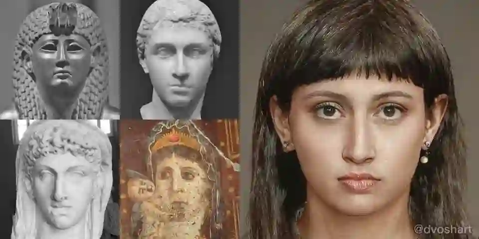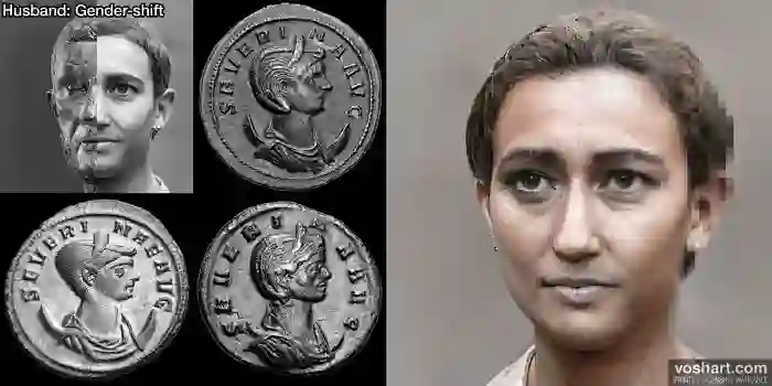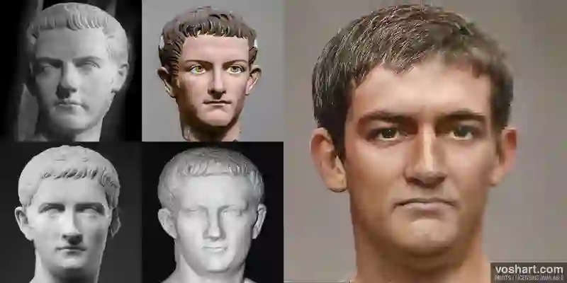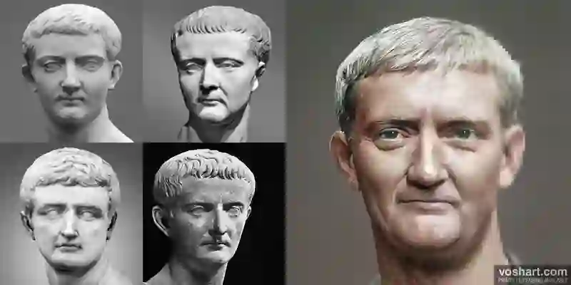 Voshart通过从雕像,硬币和绘画中收集的皇帝的图像,然后根据历史描述手动调整了肖像,并将其反馈给GAN。