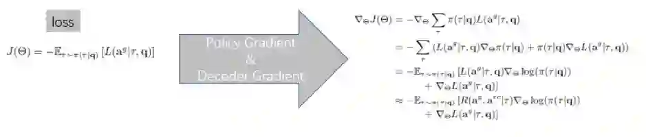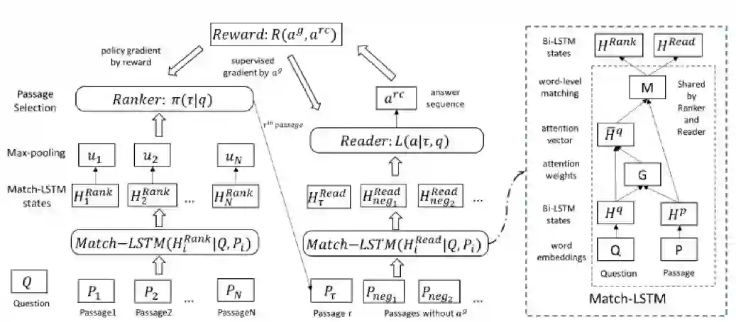 『策略』就是 Ranker 出来的篇章的概率分布,采取的动作则是挑选文章,反馈是预测出的答案片段起始位置的打分
