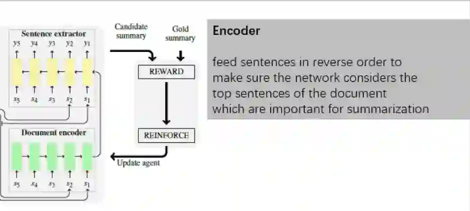 这篇论文对摘要的处理跟前面提到的两篇做摘要的论文稍有不同,但也是很经典的做法:先从文本中抽取片段,再通过片段生成摘要。其实此类框架很多,但这篇论文尝试将这两个分开的步骤通过强化学习的方式统一到了一起,倒是跟上一节的 R3 有几分相像。抽取部分和生成部分用的都是 state-of-art 的方法:前者是基于pointer-net,后者是 pointer-generator,在这里就不展开讲了。