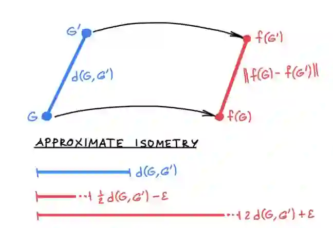 这种嵌入被称为「近似保距」。我们希望得到独立于图(特别是与定点数无关)的界 c。请注意,由于对于同构的图 G~G′,我们有 d(G,G′) 且 f(G)=f(G′),因此图同构是 (♣) 的特例。如前文所述,在所有图上实现这种近似保距是不可能的。然而,我们可以允许额外的度量失真 ε,从而使模型 (♣) 可以被进一步松弛: