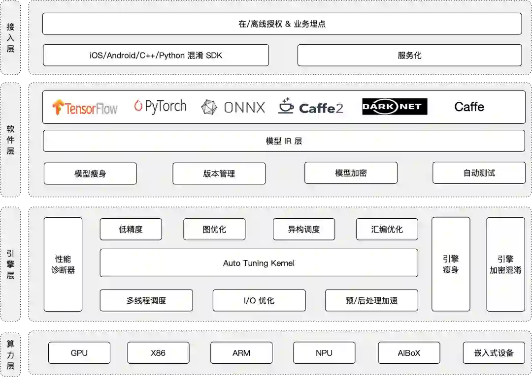 算子优化:主要整合低精度、图优化、异构调度、汇编优化等能力,同时提供 auto tuning kernel 的能力,为专用硬件提供最佳的汇编实现