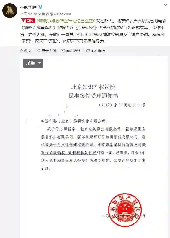 11月12日消息,中影华腾官方微博发文称:昨天,北京知识产权法院已对电影《哪吒之魔童降世》涉嫌抄袭《五维记忆》创意秀的侵权行为正式立案。此前,中影华腾公司表示电影《哪吒之魔童降世》抄袭其舞台秀作品《五维记忆》。