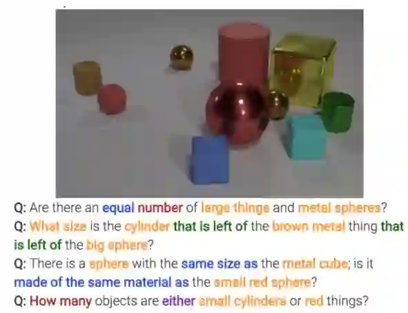 视觉推理在这里主要是限定在VQA(Visual Question Answering)的问题上,也就是让计算机看一副图,然后给出一个问题,让其回答。相比传统的VQA问题,视觉推理问题的要求是要让问题难度提升,必须经过推理才能回答。CLEVER数据集[1]就是这样一个专门针对视觉推理而诞生的数据集。CLEVER数据集是Li Fei-Fei团队做出的成果,不得不说Li Fei-Fei总是特别有远见的通过为大家贡献数据集来引领人工智能的发展。CLEVER数据集是怎样的呢?