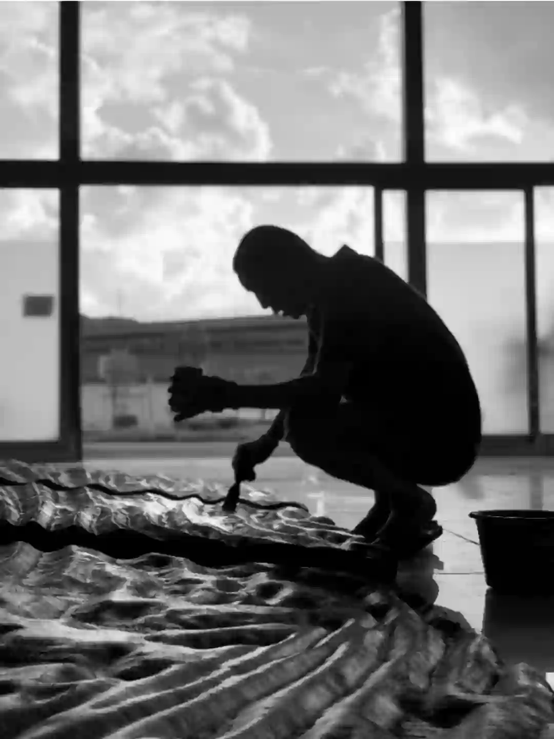 马泉享受极致的孤独,怀着对自然的敬畏之心,从44岁到57岁,他坚持每年进⼊沙漠腹地考察、探险。“沙漠是地球生命体的一部分,敬重沙漠就是敬重地球!”他猜测,沙漠无人区或许就是地球编码的⼀个区域,“我要好好的深入了解她,研究她……并‘解码’她。”这就是马泉创作动机的缘起,在沙漠探究六年之后才有的。