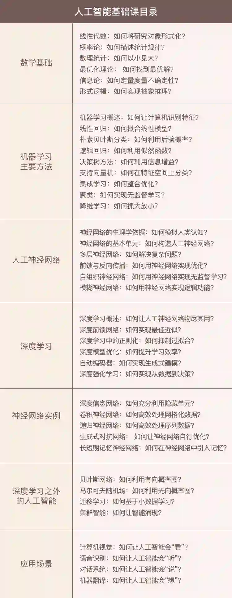 数学基础知识蕴含着处理智能问题的基本思想与方法,也是理解复杂算法的必备要素。今天的种种人工智能技术归根到底都建立在数学模型之上,要了解人工智能,首先要掌握必备的数学基础知识,具体来说包括: