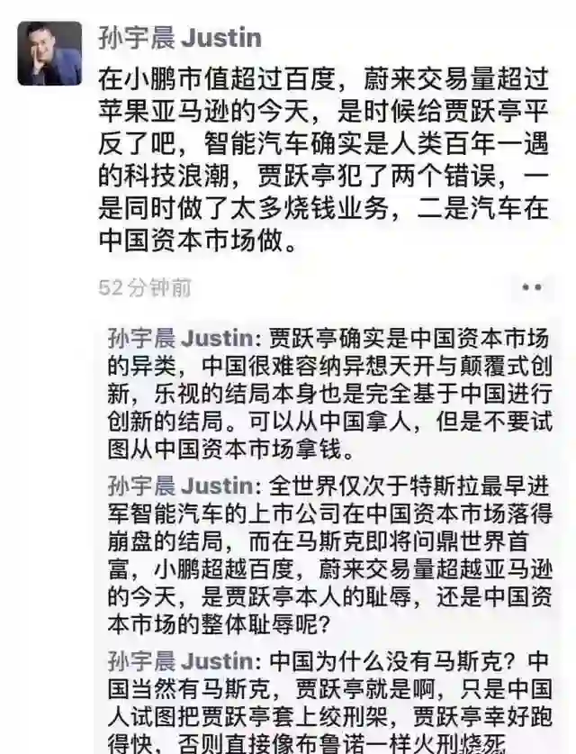 【孙宇晨喊话要为贾跃亭平反:他是中国马斯克,但颠覆式创新不被容纳】素有“币圈贾跃亭”称号的孙宇晨近日在朋友圈发表评论称,在小鹏市值超过百度,蔚来交易量超过苹果亚马逊的今天,是时候给贾跃亭平反了吧。孙宇晨表示,智能汽车确实是人类百年一遇的科技浪潮,贾跃亭犯了两个错误,一是同时做了太多烧钱业务,二是汽车在中国资本市场做。贾跃亭确实是中国资本市场的异类,但中国很难容纳异想天开与颠覆式创新。