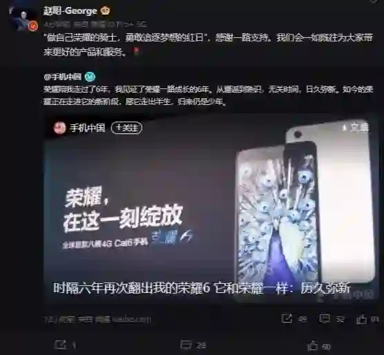 【荣耀脱离华为后赵明首度发声:做自己荣耀的骑士】11月29日,荣耀终端有限公司CEO赵明通过个人微博发文称,“做自己荣耀的骑士,勇敢追逐梦想的红日”,感谢一路支持。我们会一如既往为大家带来更好的产品和服务。
