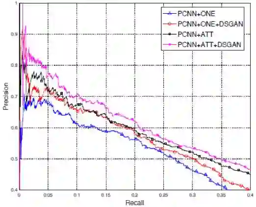 从图中可以看出,经过DSGAN降噪之后,基于CNN和基于PCNN的模型在关系抽取任务上的表现都有着显著的提升。