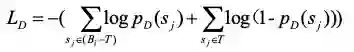 表示)、得分低于阈值的标注为正例(该数据由T表示),重新标注后的句子输入到判别模型中,将判别模型的判决结果作为生成模型反向求导调参的依据。这里生成模型的损失函数如公式(1)所示: