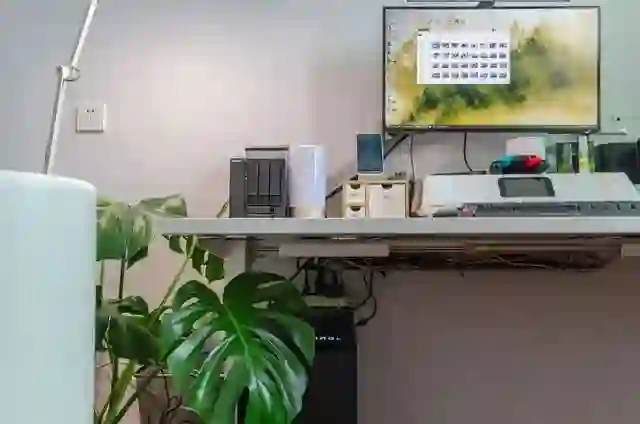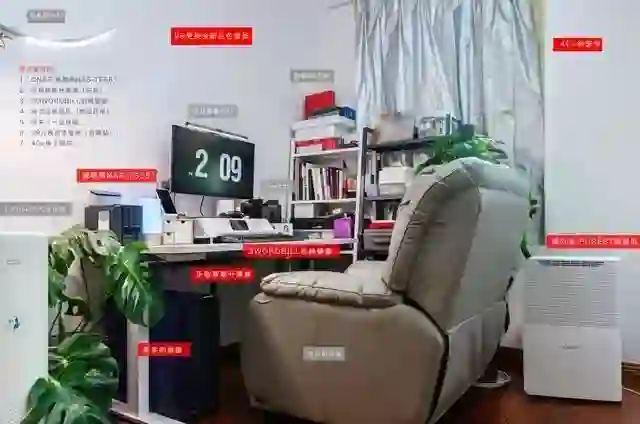 乐歌升降桌、QNAP 的 NAS、机械键盘、网件路由、浦力适除湿机、空气净化器、绿植、墙纸、窗帘等。