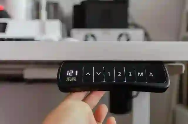 E2 的控制器可以选择安装在左右任意一边,亮面比较容易刮花。从左到右分别是:显示屏、上下升降键、1/2/3 档记忆功能、M 挡高度记忆键、A 久坐提醒。