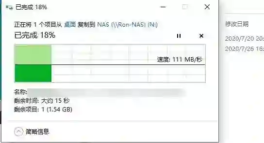 可以看到我从电脑上直接向 NAS 上复制文件,传输速率为 111MB/S,达到了千兆满速,相互直接访问传输基本没有问题了。