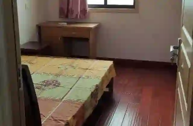 一张床、一张桌子、一个床头柜粉色花墙纸,粉色布窗帘,这对于追求简单风格的我来说不太能接受。