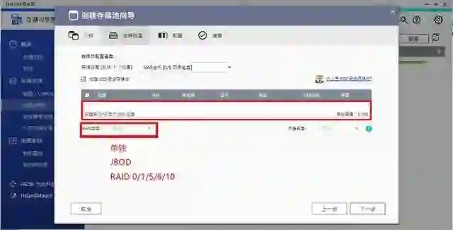 这时候你的所有可用硬盘会罗列在第一个红色框内,选中所有硬盘后,下面有个 RAID 类型,这就是选择硬盘的组态,一般有 JBOB 模式,以及 RAID 0/1/5/6/10 等模式,基本上 2 块用 RAID 1,3 块以上用 RAID 5 即可。