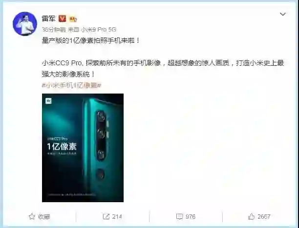 小米创始人雷军表示,量产版的1亿像素拍照手机小米CC9 Pro,将打造小米史上最强大的影像系统。据悉,在该发布会上,还有小米手表,以及全新的小米电视5 同场发布。