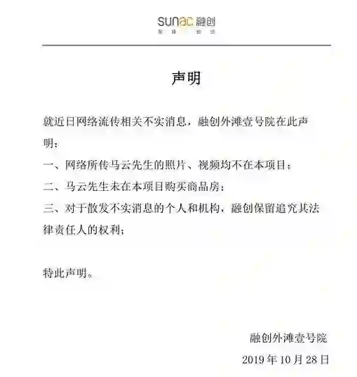 此外,融创外滩壹号院对此发表声明称,马云先生未在融创外滩壹号院购买商品房,网络所传马云先生的照片、视频均不在此项目。