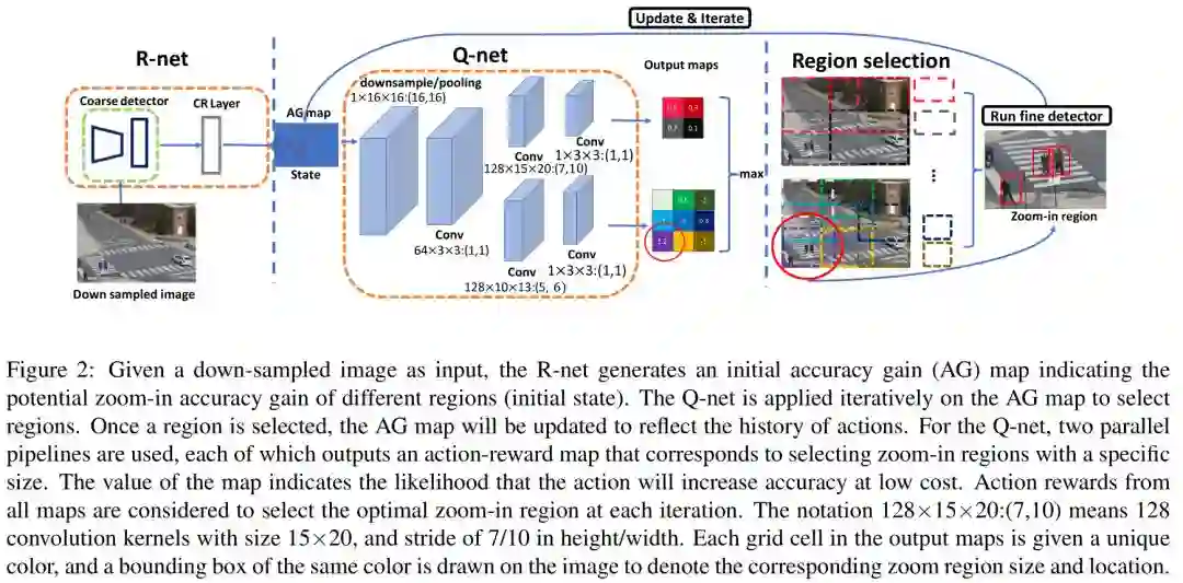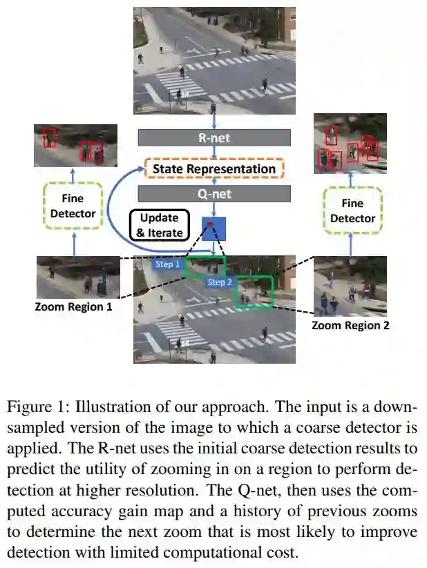 作者提出了一个用于检测高分辨率图像中不同尺度目标的方法,减少计算量的同时,保证了检测的准确率。整体是一个从粗糙到精细(coarse-to-fine)的检测流程。先使用 R-net 检测下采样的图像,再使用 Q-net 通过强化学习选择能提高准确率的区域进行放大检测。最后实验表明,相比于直接检测高分辨率图像,作者的方法在自己的数据集上减少了 50% 的像处理,同时保证准确率不降低。