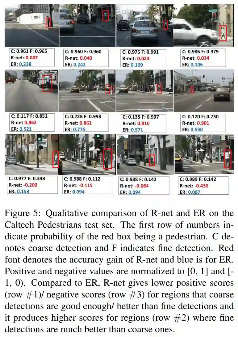 其中 C 和 F 分别表示粗糙和精细检测器预测红框是行人的概率,红色值表示 R-net 预测的 accuracy gain,蓝色的值表示使用交叉熵损失。