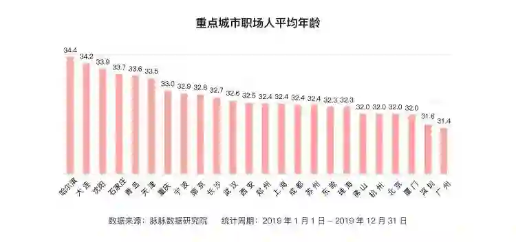 城市中职场人的年龄,也反映着城市人才的活力和未来的发展潜力。北方城市的平均年龄整体偏高,整体上不难发现,年轻的职场人在城市选择上,更倾向于珠三角地区和南方城市。