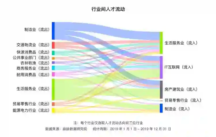 2019年,生活服务业取代金融行业,成为IT互联网人才离职后的首要去处,金融业和房产建筑业分别位列二三位。