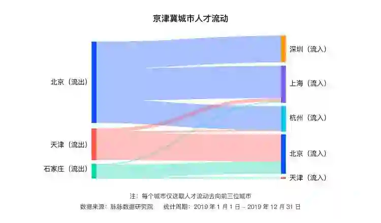 广州、深圳与上海的人才与所在城市群的融合更为紧密,长三角的苏州杭州、珠三角的东莞,都有效承接了中心一线城市的人才溢出。而北京周边的城市群的人才承接能力则较弱。离开北京的人才,以南下为主,上海、深圳和杭州成为前三的去处。杭州正毫无疑问成为吸引人才的“机遇之城”。