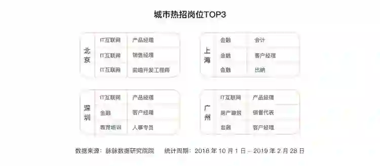 2019年,各城市继续力推互联网等新经济产业,尤以上海最为显著。2018年的数据可以发现,上海主要对金融人才的需求最为旺盛。而2019年热招的岗位TOP3则都变成了互联网相关岗位,且以开发等技术岗为主。2019年,以拼多多、小红书、B站等为代表的上海互联网企业,显著推高了上海互联网人才的需求。