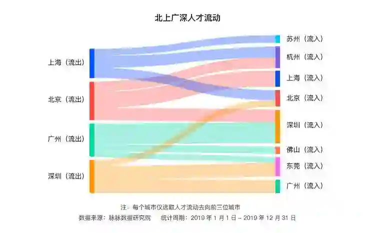 北京优势仍然明显,分析北京、上海、广州及深圳四个一线城市的人才流出目的地前三名可见,北京“掐尖式”吸引人才最为明显,上海、深圳、广州的人才流出目的地中,北京均占有一席之地。