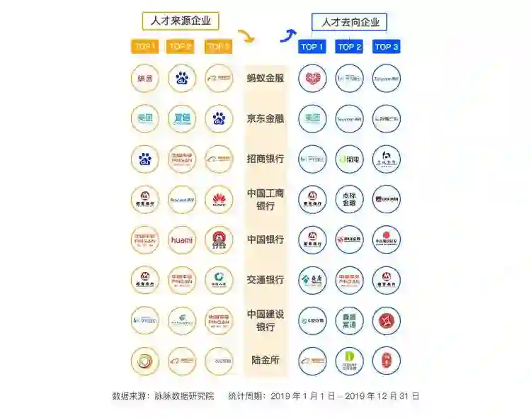 蚂蚁金服、京东金融等有互联网基因的金融公司,仍以互联网公司间流动为主。传统银行中,国有四大行人才主要仍是在金融证券类公司之间流动,而总部位于深圳的招商银行,则“互联网化”了许多,不管是流入还是流出,都有不少阿里、字节跳动等互联网公司的身影。