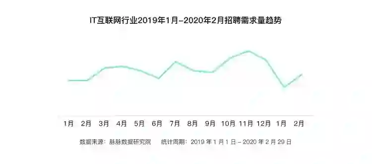 IT互联网行业的招聘需求在2020年1月降到了谷底,不过,在疫情造成全面影响的2月份,IT互联网出现了招聘需求的小幅抬头。疫情对所有行业都带来了严重冲击,但也激活了一些在线业务模式的发展空间,在线教育、医疗以及办公协作工具等领域需求看涨,危中有机。