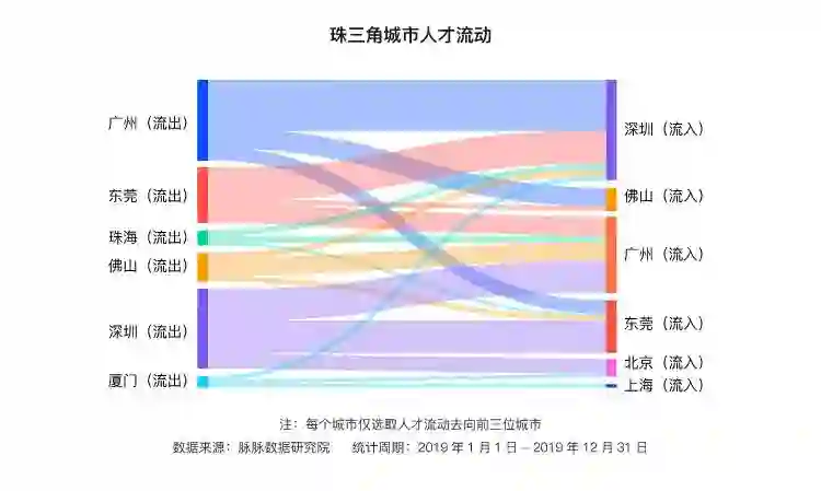 值得注意的是,长三角与珠三角这两大城市群间人才流动并不紧密。长三角城市中,仅有杭州的人才把深圳作为主要目的地,其余城市均以“圈内+北京”流动为主。同样的,珠三角的人才流动也均以区域内城市和北京流动为主,鲜有向长三角流动。