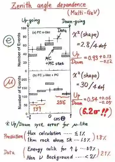 会议的高潮出现在第二天上午,梶田隆章代表超级神冈合作组报告了关于大气中微子的测量结果,在6.2σ置信度的水平发现了大气中微子振荡现象,而且其结论是模型无关的!当时Power Point放映技术还没有被发明,所有的报告人使用的都是透明片,梶田隆章的报告中最重要的一页如图所示。这一革命性的发现开启了中微子物理学的新篇章,也预示着中微子振荡实验的春天已经来临。