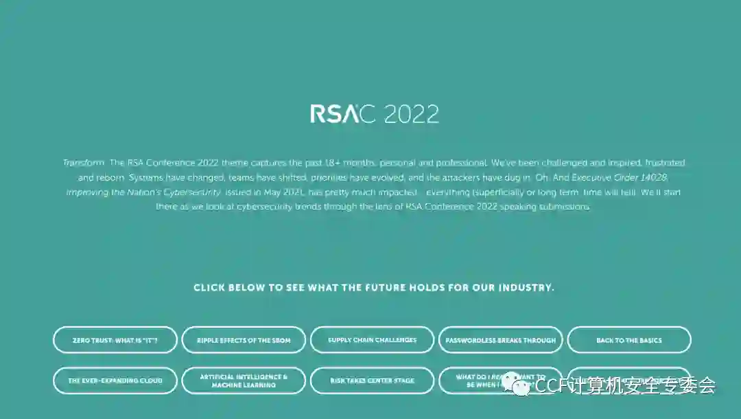 RSA大会每年都会有一个主题,本次大会的主题为Transform(转型)。提到转型,大家都不陌生,数字化转型是我国十四五规划的关键词。2022年的主题Transform(转型)是去年RSA大会主题Resilience(弹性)[3]的进一步延伸。弹性者,指的是小到企业面临网络攻击的应急和恢复,大到企业在疫情期间的存续和发展,这是转型的目的和意义。