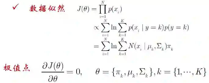 第三是如何通过似然的极大化估计模型中的参数,主要是均值、斜方差矩阵和混合比例。