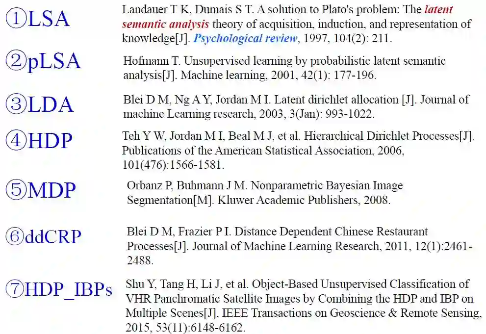 LDA模型已经足够好了,但是还有一个缺陷,必须要知道类别的数量,然而在遥感图像里给定一幅图像之后要确定有多少类也不是很容易的事情,更深一步的HDP模型可以完成这个任务,HDP模型的推导过程就是经典的中餐馆过程(CRP):