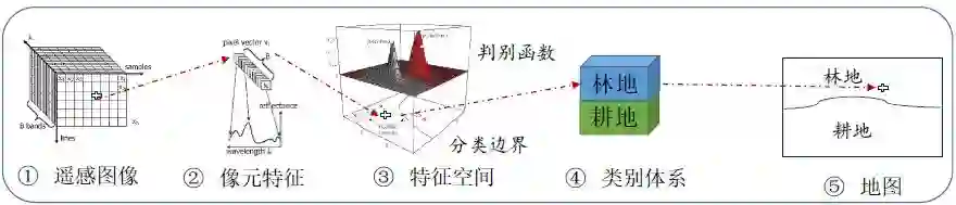 对于遥感图像而言,语义分割不是一个新的概念。在遥感图像分类的研究中,最开始研究者就想实现对一幅图像在每个像元上给出一个语义类别。最典型的方法就是提取像元的特征,对于每个像元的特征,通过一些算法对特征空间进行分割之后,判断像元处于特征空间的什么位置,据此从给定的类别集中选择一个类别,就可以把所有的像元结合在一起,形成一个专题地图,具体流程如下图所示。这种方法和我们刚才的语义分割达到的目的一样,区别是这种方法是基于像元实现分类。