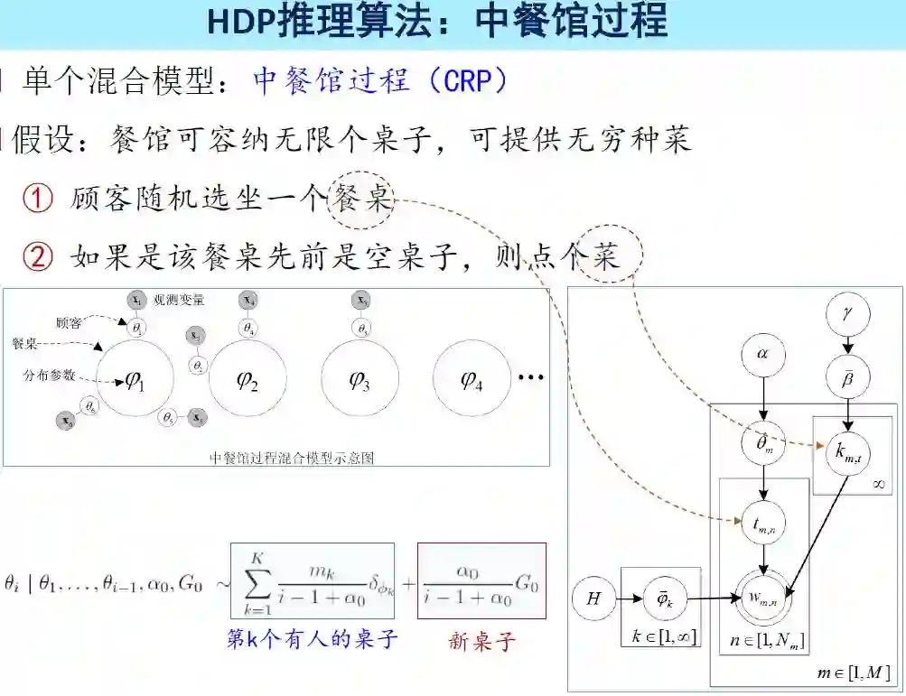 假设餐馆里面有很多桌子,有很多菜,推理的过程可以简化为:顾客要随机选择一个餐桌坐下来,如果餐桌之前没有人坐过,那就去点一个菜。与LDA不同的地方在于每次都可能会产生新桌子,这样能够推断出桌子的数量。每一篇文章是一个餐馆,所有的菜都是共享的,餐馆里面大家用同一种菜单。选桌子过程对应的就是图像分割过程,点菜的过程就是分类的过程。