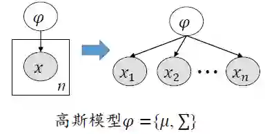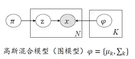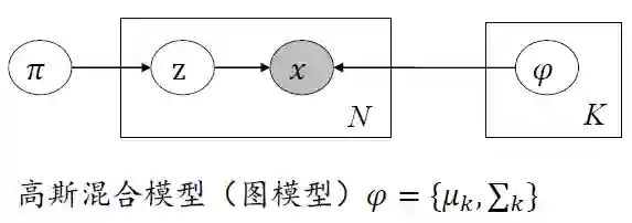 图中,圆圈代表随机变量,涂黑的部分表示图像像元或其特征,圆圈之间的箭头表示依赖关系。例如x观测量会依赖z和φ,其中φ就是高斯模型中的参数。