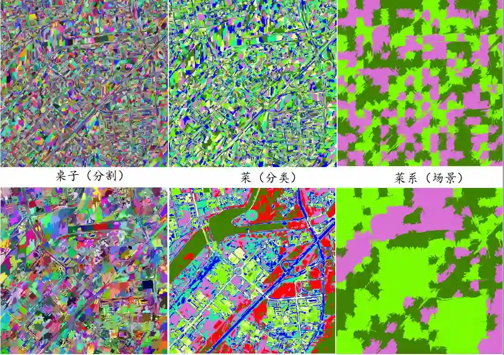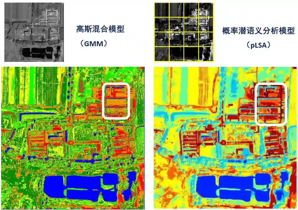 其中不同的颜色代表不同的主题或者不同的类,仔细观察,可以发现左侧很多阴影部分被当成了水,而右侧没有这种情况。这是因为主题模型能够根据不同的状况,对同种元素在不同的地方产生不同的理解。