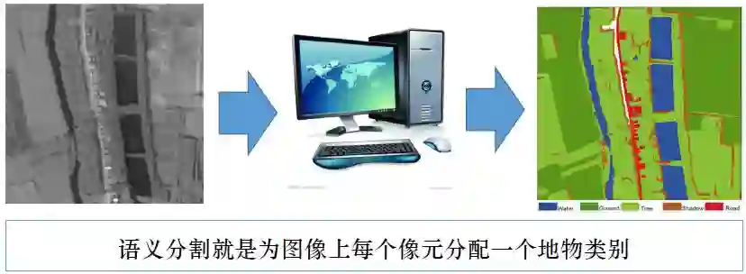 什么是语义分割?如图所示,我们给机器一幅图像,希望机器给出专题地图,专题地图在每个像元上都会有一个对应的语义类别。简单的说,语义分割就是为图像上每一个像元分配一个地物类型的方法。本文的重点是讨论在非监督情况下如何对图像进行语义分割。