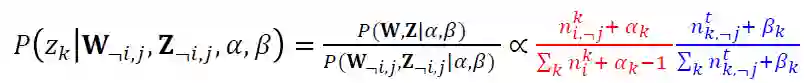 对比pLSA和LDA,可以发现LDA增加了两个参数α和β,它们是Dirichlet分布的参数,LDA增加Dirichlet分布有一个好处,由于这两个分布是共轭分布,使得最终结果的计算变得非常容易,直接利用如下的公式就可以: