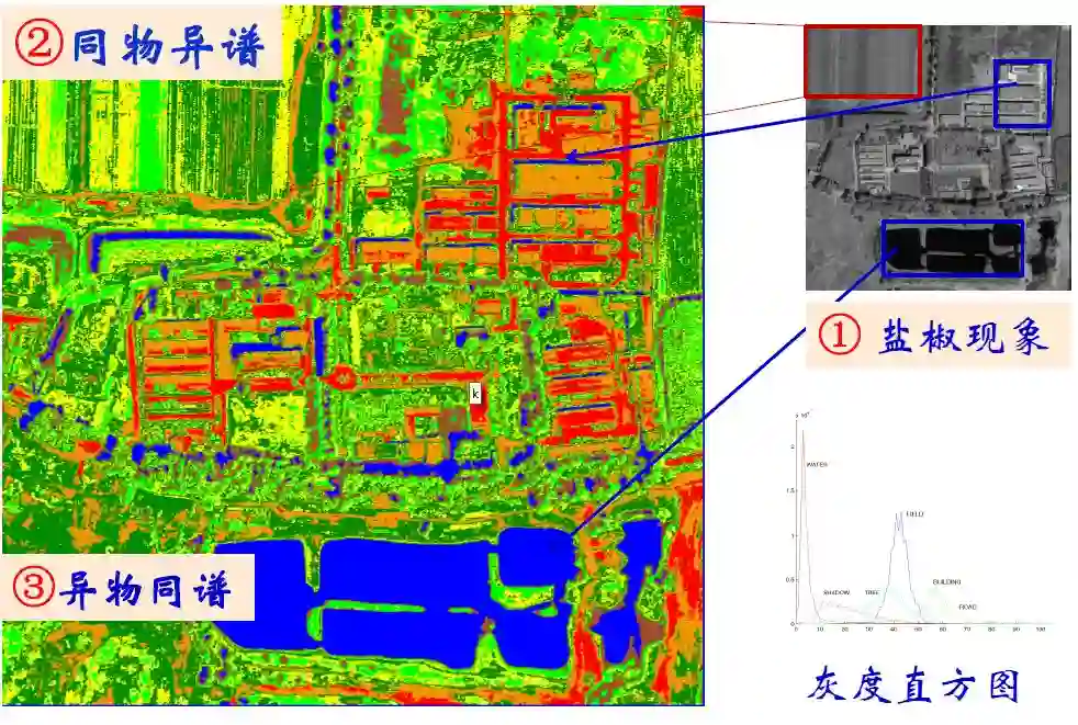 将这个方法用在遥感图像上,如图所示,假设我们要分析的图像是图中的灰度图像,我们采用灰度值作为观测像元的特征,用高斯混合模型聚类,观察结果,我们会发现几个特点,一是有的地方类别分布非常破碎,我们称为“盐椒类现象”,二是有的地方被分割成多种颜色,这种情况就是同一个物体由于灰度不同,被聚成不同的类型。另外在图中我们可以发现水体和建筑区域形成阴影的DN值非常相近,这种将光谱值相同的、不同物体归成同一个类的情况在遥感图像中称为异物同谱,之所以出现这些问题,主要原因是基于像元的分类只是在对应的特征空间进行分类过程,没有考虑到图像平面像元之间的位置、形态等关系。