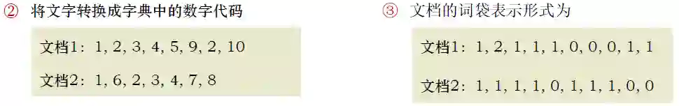 然后,用数字替换掉这两篇文章所对应的字,然后按构造的字典,统计每个字在文章中出现的次数: