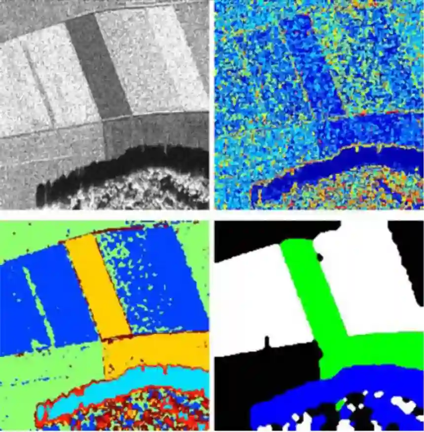 其中左上图是初始的SAR图象,如果纯粹的用CRP进行聚类,就相当于使用类数不给定的一个高斯混合模型,那么得出的结果如右上所示,可以看出斑点很多,结果不好。左下图是增加了Markov先验约束相对弱一点的情况,右下图是约束强一点的情况,可以看出空间一致性得到了增强。